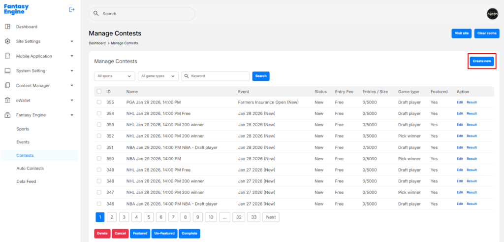 Navigation Path: Admin Dashboard > Fantasy Engine > Contests