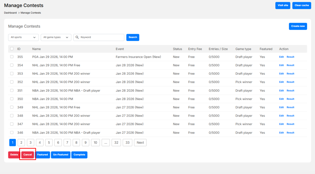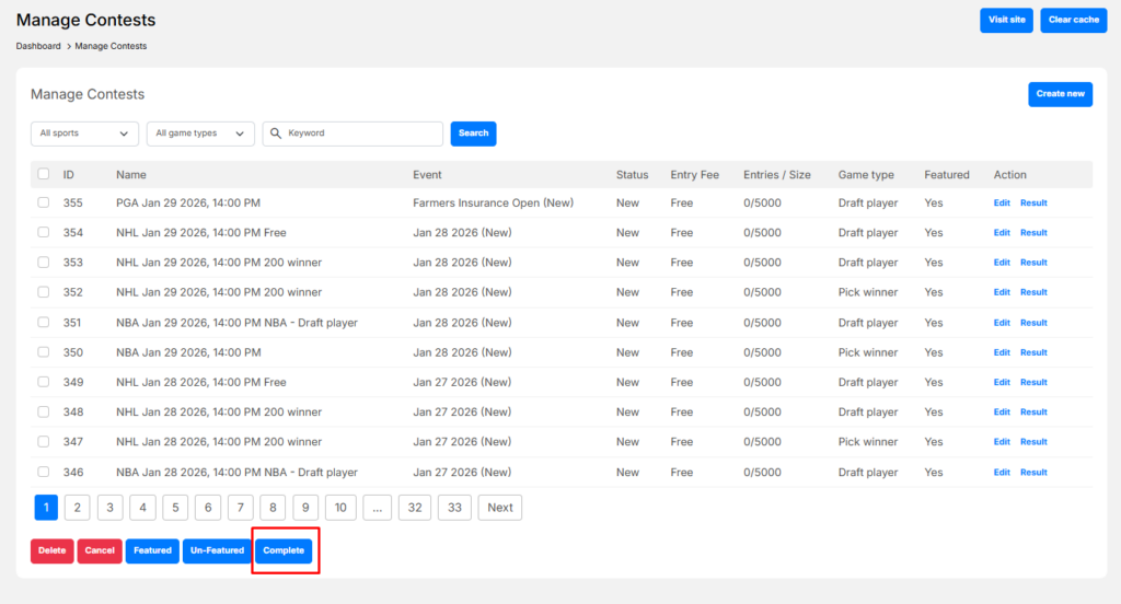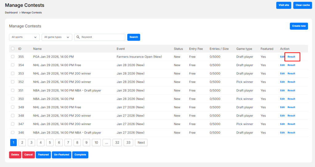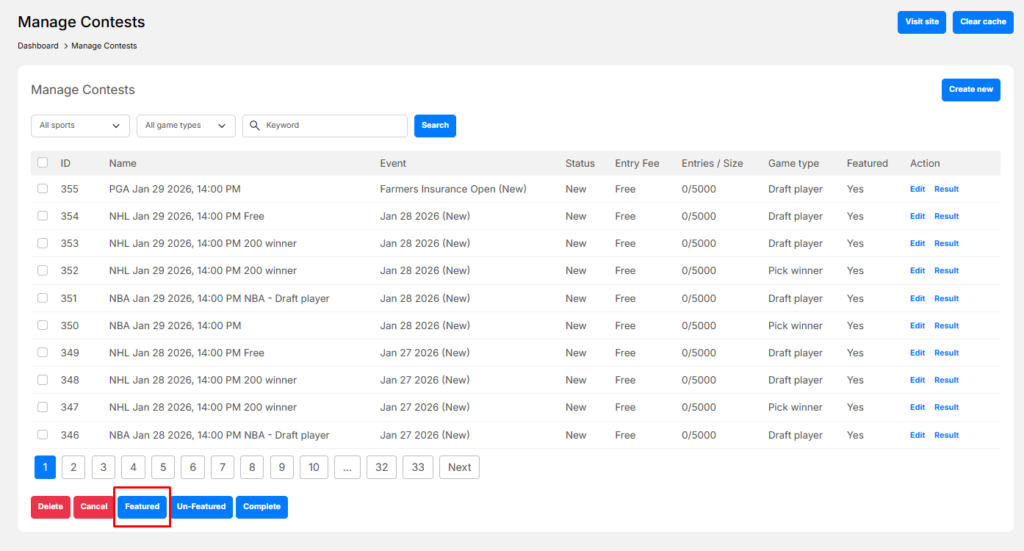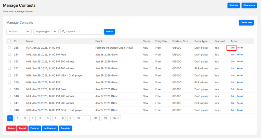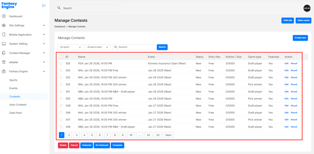 This section explains how administrators can manage contests in the Fantasy Engine.