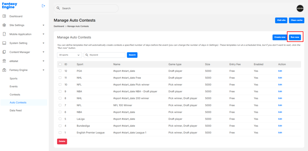 Navigation path: Admin Dashboard → Fantasy Engine → Auto Contests → Click Create new.