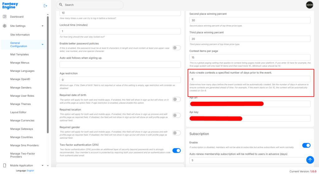 Navigation path: Admin Dashboard → Site Settings → General Configuration → Fantasy Engine