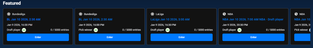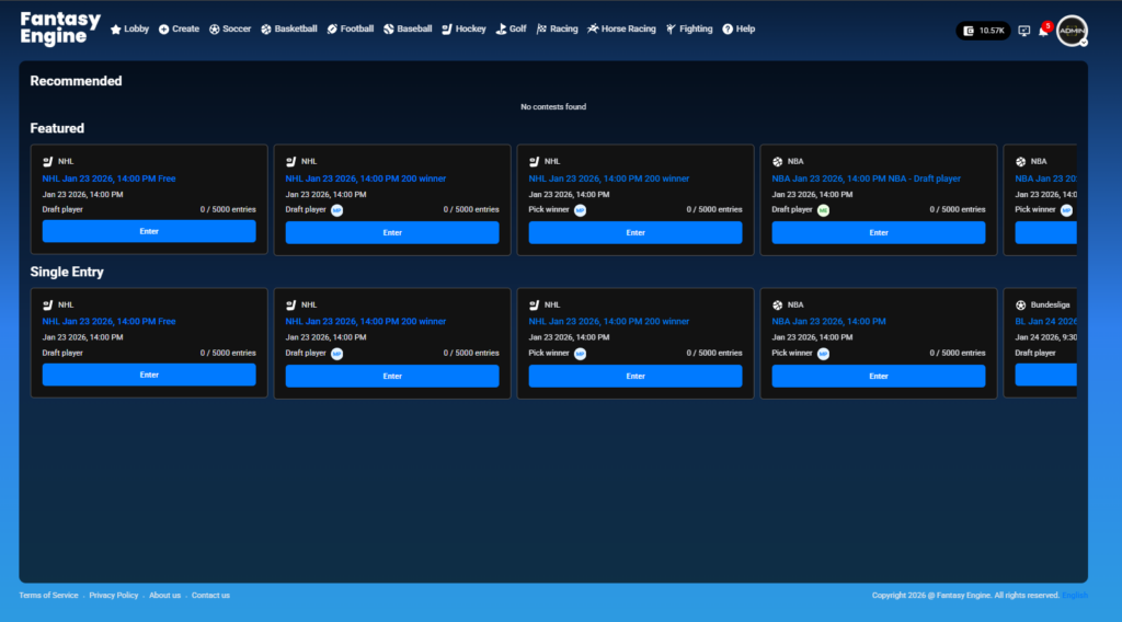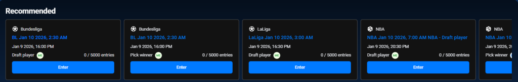 Displays contests suggested for you based on popularity, sport type, or system recommendations. This section helps users quickly join trending contests.