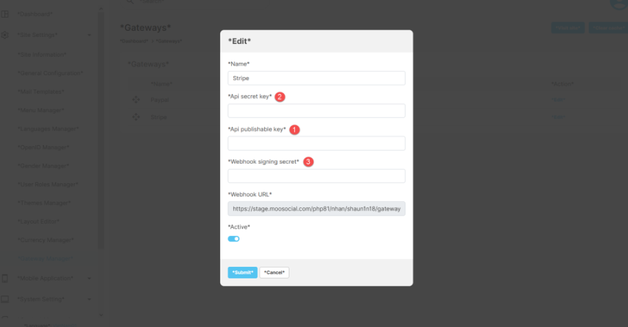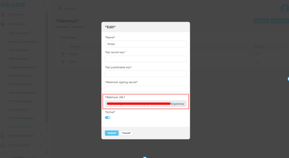 Access to admin panel -> Site settings -> Gateway manager. Click on the “Edit” option of the Stripe option and copy “Webhook URL”.