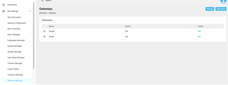 Access to admin panel -> Site settings -> Gateway manager. Click on the “Edit” option of the Stripe option.