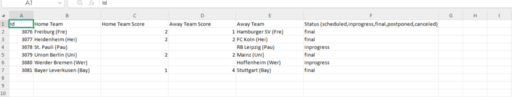 - Fixtures sheet: Match information (Home Team, Away Team, Scores, Status).