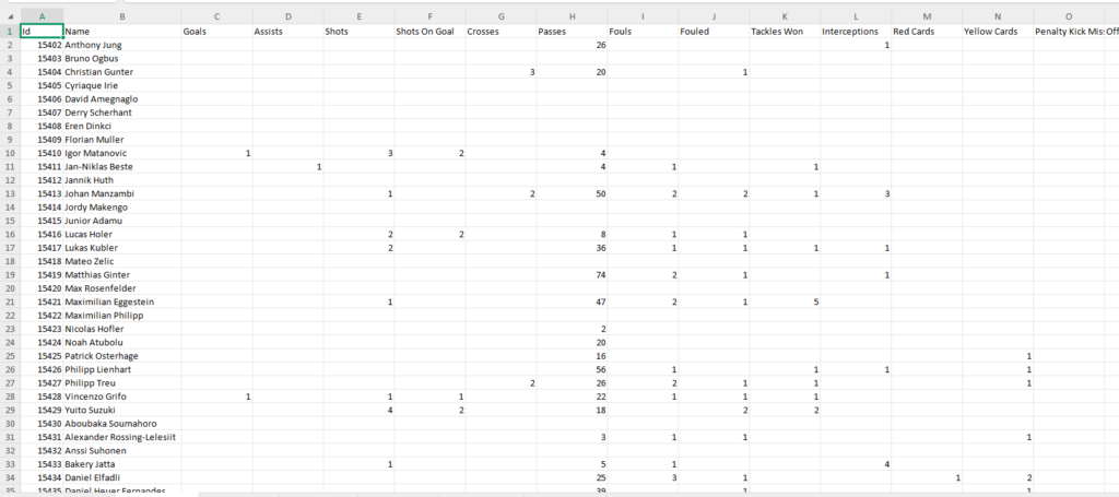 - Match detail sheets (per fixture): Player statistics template.