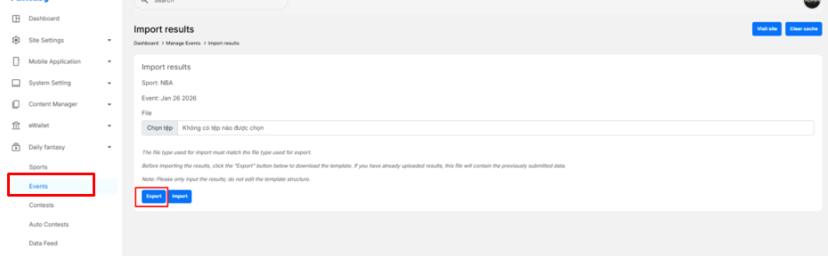 The Import / Export Event Results feature allows administrators to manage match results and player statistics in bulk using Excel files. This helps ensure accurate scoring and timely settlement of contests.