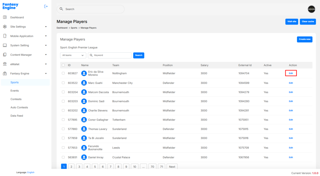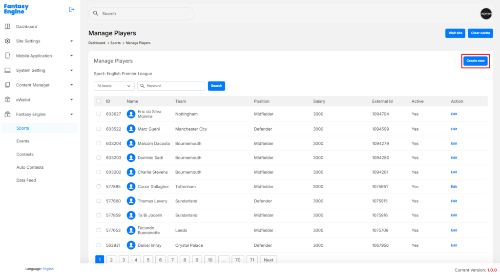 Navigation Path: Dashboard > Daily Fantasy > Sports > Manage Players > Create New